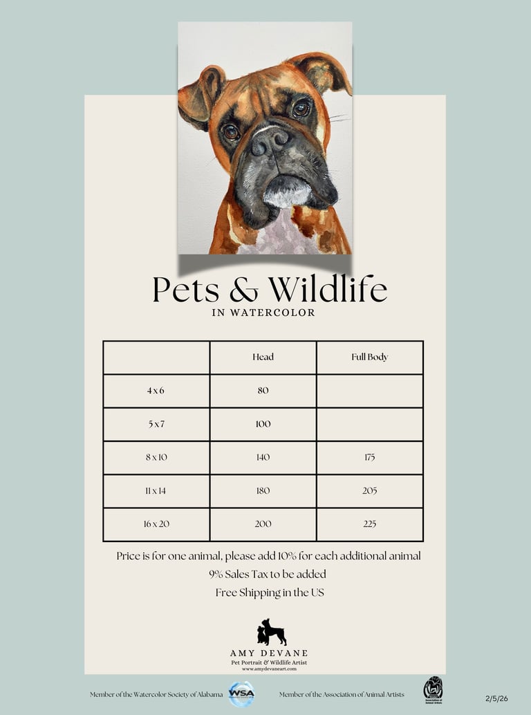 If you would like to schedule a pet or wildlife portrait with me, please follow the instructions outlined below. Completing this form does not require payment at this stage. Once I receive the completed form and we verify all the details, I will provide you with an invoice via email for a $50 nonrefundable deposit. Your booking will be finalized only upon receipt of this deposit. The remaining balance will be due once the painting is completed. I will reply to your request via email. Please be sure to check your spam or junk folders if you are expecting a response from me.